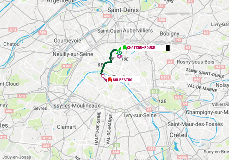 Il n'y a pas de ligne de métro directe entre les stations Château Rouge et Solférino. Le trajet est effectué avec une correspondances entre les lignes
