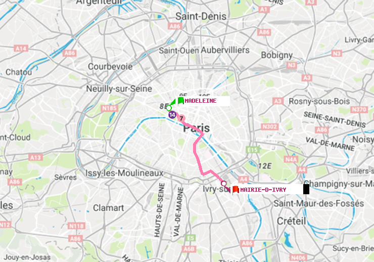 Il n'y a pas de ligne de métro directe entre les stations Madeleine et Mairie d'Ivry. Le trajet est effectué avec une correspondances entre les lignes