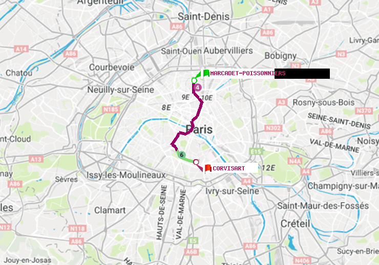 Il n'y a pas de ligne de métro directe entre les stations Marcadet-Poissonniers et Corvisart. Le trajet est effectué avec une correspondances entre les lignes