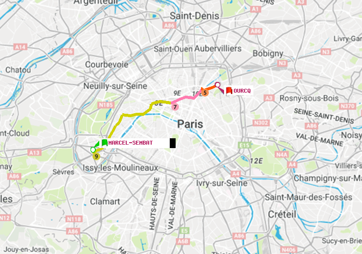 Il n'y a pas de ligne de métro directe entre les stations Marcel Sembat et Ourcq. Le trajet est effectué en 2 correspondances entre les lignes : ligne