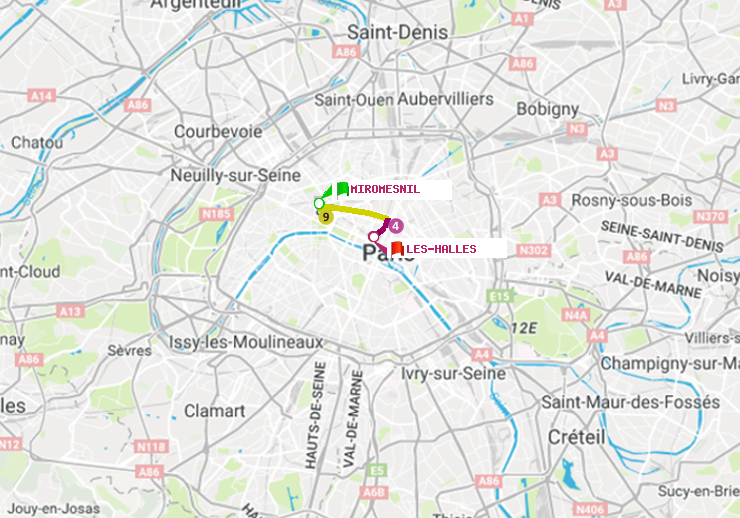 Il n'y a pas de ligne de métro directe entre les stations Miromesnil et Les Halles. Le trajet est effectué avec une correspondances entre les lignes