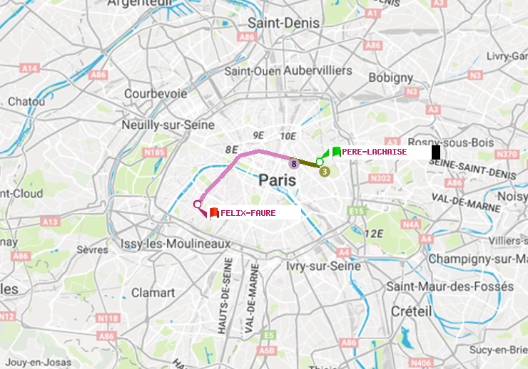 Il n'y a pas de ligne de métro directe entre les stations Père-Lachaise et Félix Faure. Le trajet est effectué avec une correspondances entre les lignes