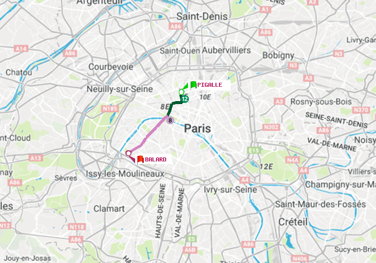 Il n'y a pas de ligne de métro directe entre les stations Pigalle et Balard. Le trajet est effectué avec une correspondances entre les lignes