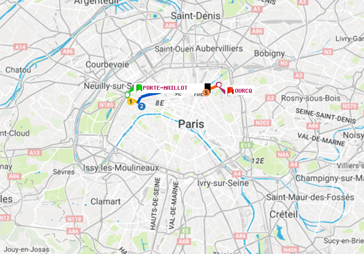 Il n'y a pas de ligne de métro directe entre les stations Porte Maillot et Ourcq. Le trajet est effectué en 2 correspondances entre les lignes : ligne