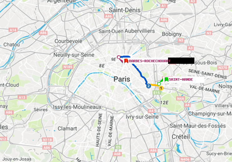 Il n'y a pas de ligne de métro directe entre les stations Saint-Mandé et Barbès-Rochechouart. Le trajet est effectué avec une correspondances entre les lignes