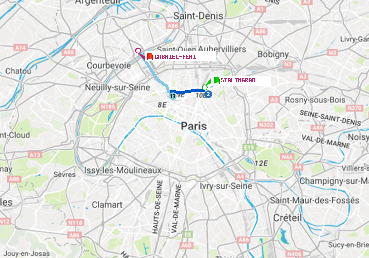 Il n'y a pas de ligne de métro directe entre les stations Stalingrad et Gabriel-Péri. Le trajet est effectué avec une correspondances entre les lignes