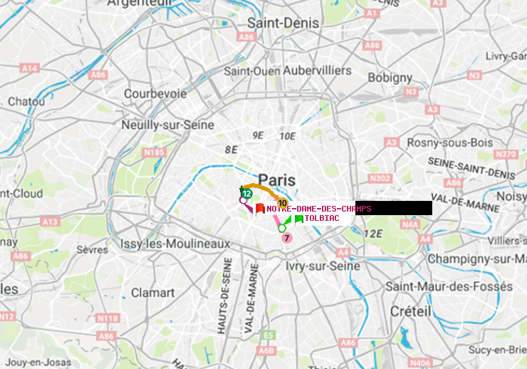 Il n'y a pas de ligne de métro directe entre les stations Tolbiac et Notre-Dame des Champs. Le trajet est effectué en 2 correspondances entre les lignes : ligne